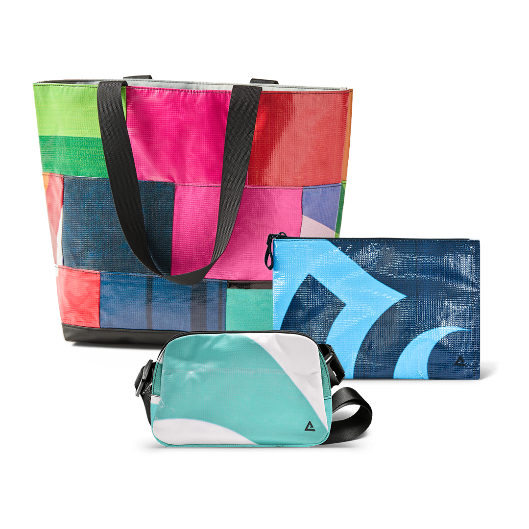 Built from durable, water-resistant materials that once lived life outdoors, these bags are tough enough for daily wear and tear while keeping thousands of pounds of vinyl out of landfills.