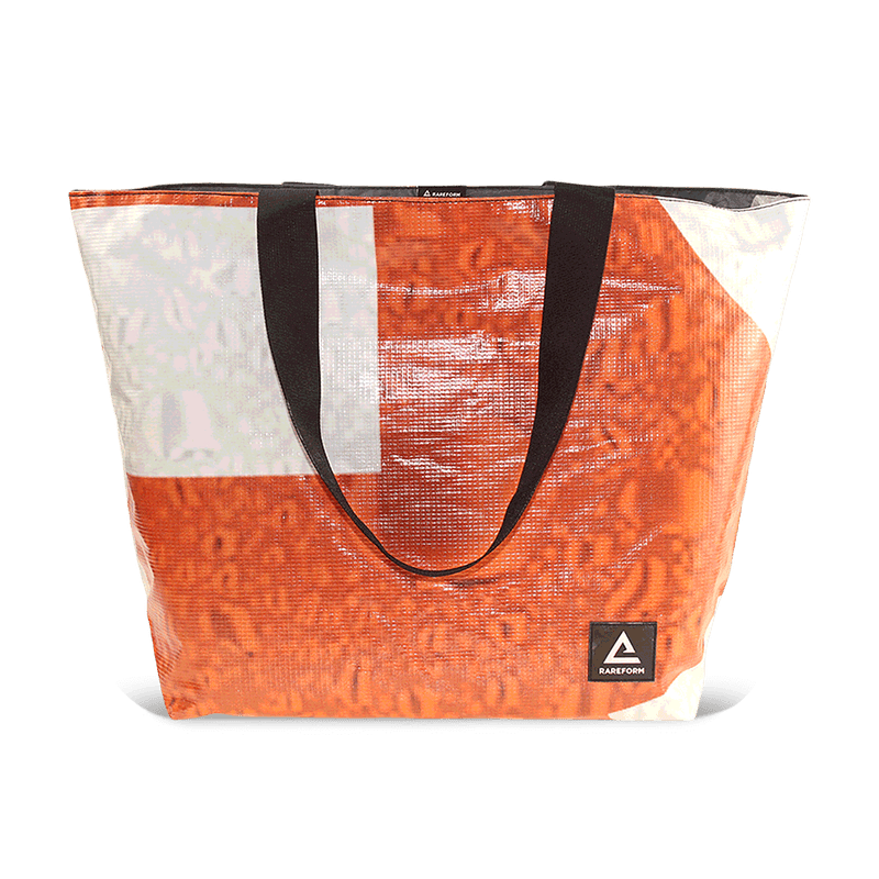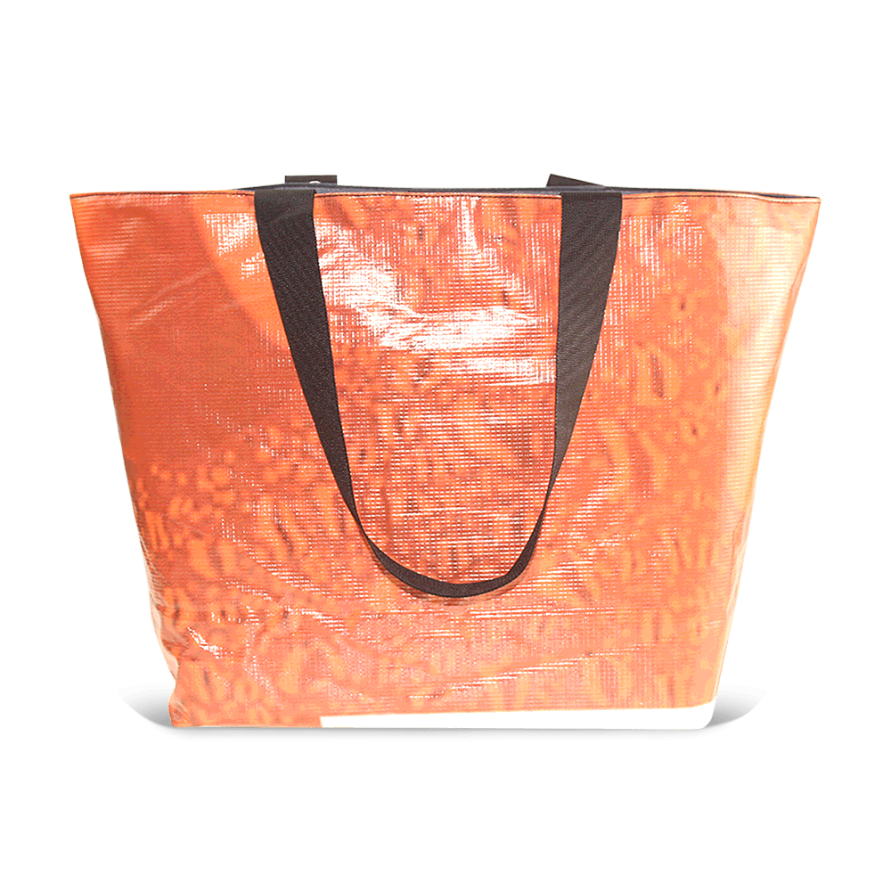 Our high volume Blake Tote bag is spacious enough for daily essentials and perfect for the beach or farmer's market. The exterior of the bag is made from 100% repurposed billboard vinyl that is water resistant, lightweight, and easy to clean.