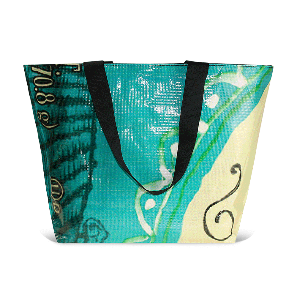 Our high volume Blake Tote bag is spacious enough for daily essentials and perfect for the beach or farmer's market. The exterior of the bag is made from 100% repurposed billboard vinyl that is water resistant, lightweight, and easy to clean.