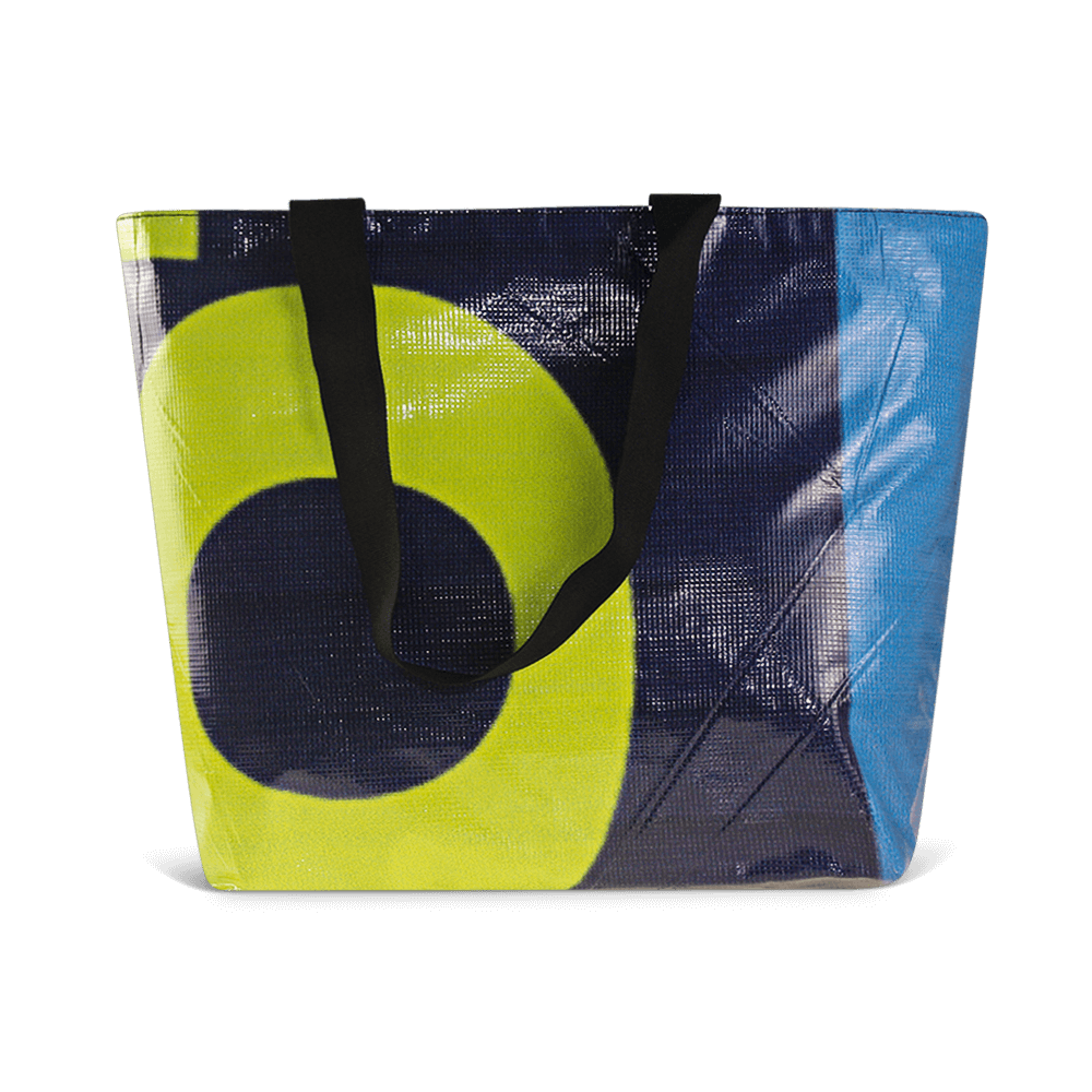 Our high volume Blake Tote bag is spacious enough for daily essentials and perfect for the beach or farmer's market. The exterior of the bag is made from 100% repurposed billboard vinyl that is water resistant, lightweight, and easy to clean.