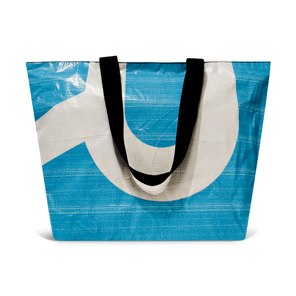 Our high-volume Blake Tote bag is spacious enough for daily essentials and perfect for the beach or farmer's market. The exterior of the bag is made from 100% repurposed billboard vinyl that is water-resistant, lightweight, and easy to clean.