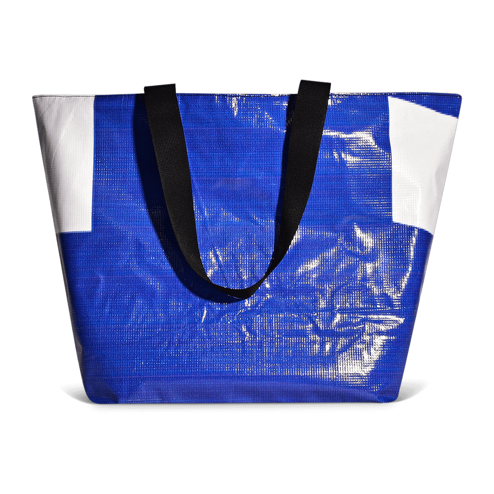 Our high volume Blake Tote bag is spacious enough for daily essentials and perfect for the beach or farmer's market. The exterior of the bag is made from 100% repurposed billboard vinyl that is water resistant, lightweight, and easy to clean.
